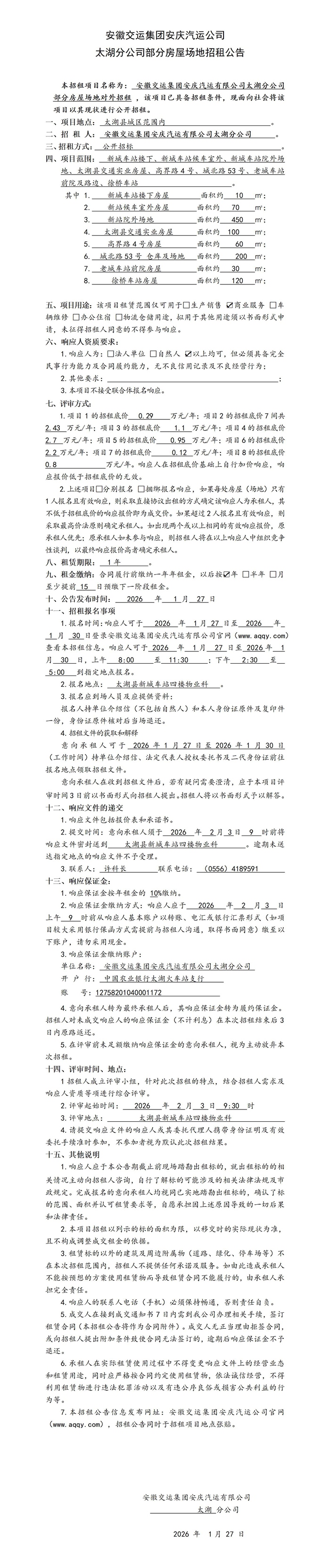 太湖分公司房屋場(chǎng)地招租公告