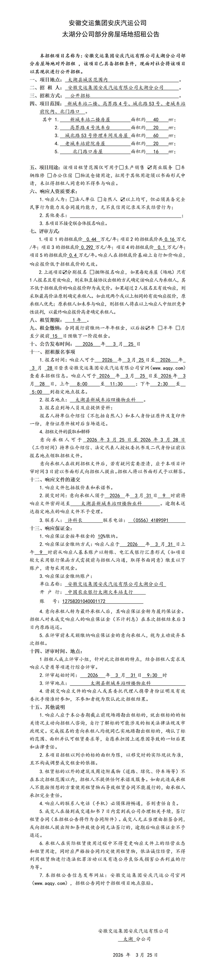 太湖分公司部分房屋場地招租公告