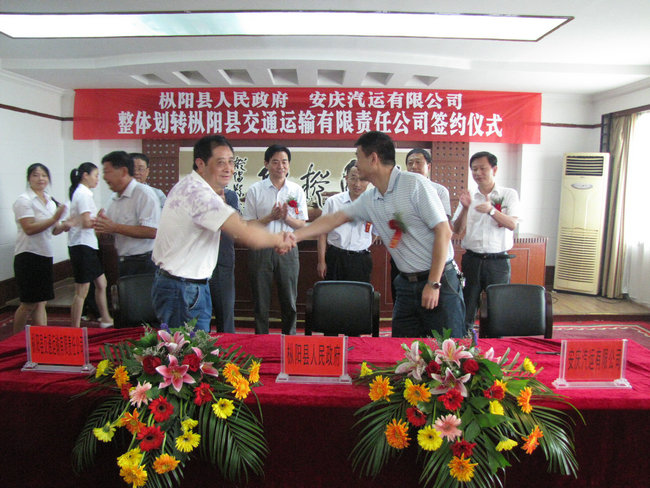 2011年9月1日,樅陽縣人民政府、安徽省交通集團(tuán)安慶汽運(yùn)有限公司整體劃轉(zhuǎn)樅陽縣交通運(yùn)輸有限責(zé)任公司簽約儀式在樅陽迎賓館會(huì)議大廳內(nèi)隆重舉行。樅陽縣縣長(zhǎng)何謙、副縣長(zhǎng)胡海峰,省交通集團(tuán)汽車運(yùn)輸有限公司副總經(jīng)理方詩喬,安慶汽運(yùn)有限公司董事長(zhǎng)張進(jìn)、黨委書記徐軍、副總經(jīng)理王中明、彭宏、紀(jì)委書記郭峰,樅陽縣交通運(yùn)輸有限責(zé)任公司經(jīng)理童子健出席了簽約儀式。