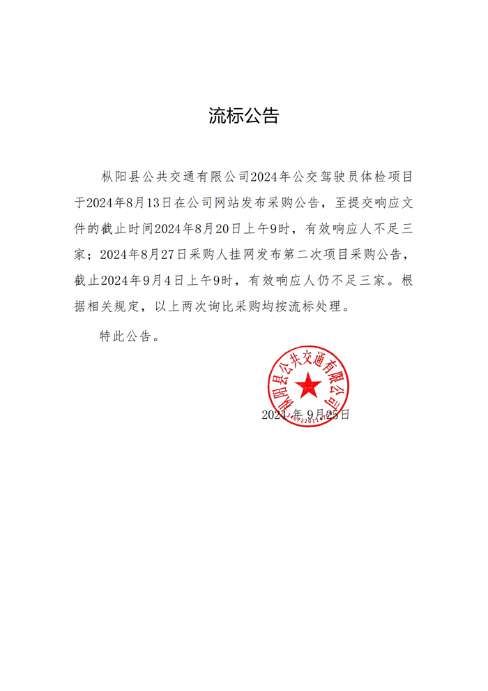 樅陽公交駕駛員體檢項(xiàng)目流標(biāo)公告